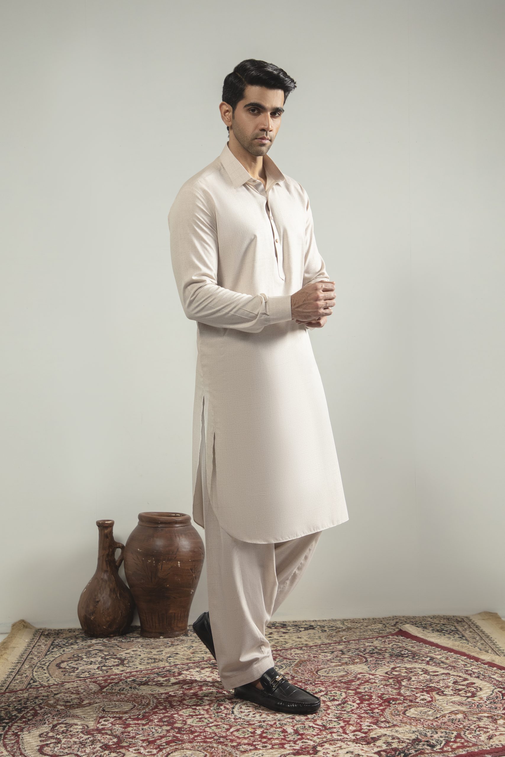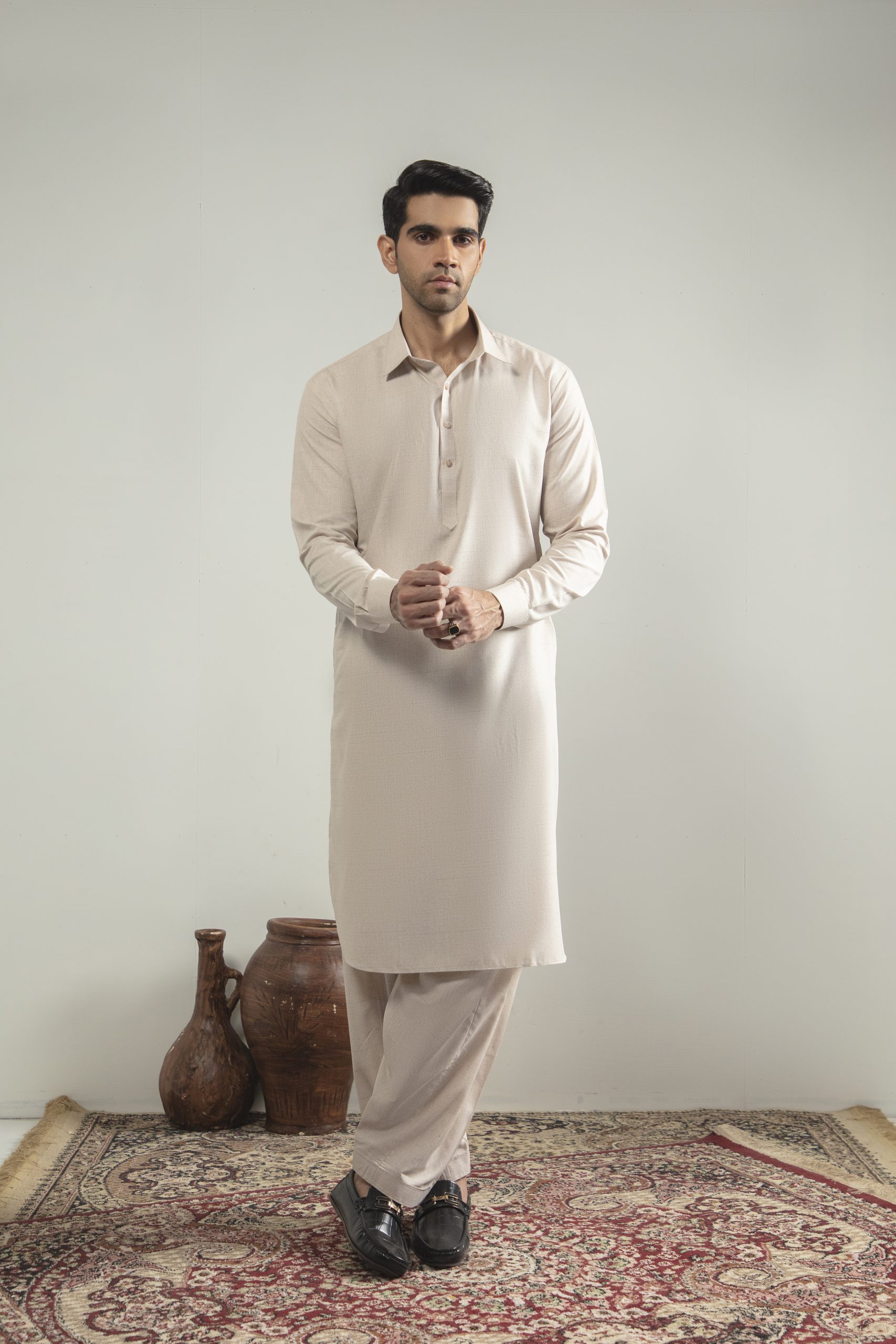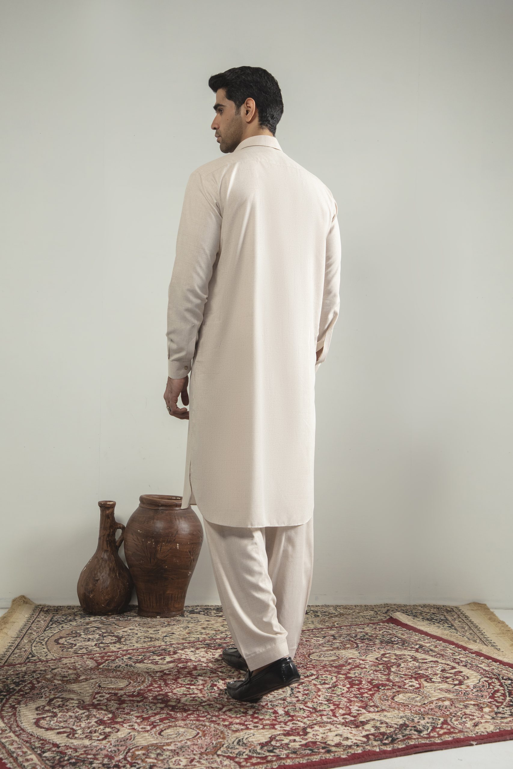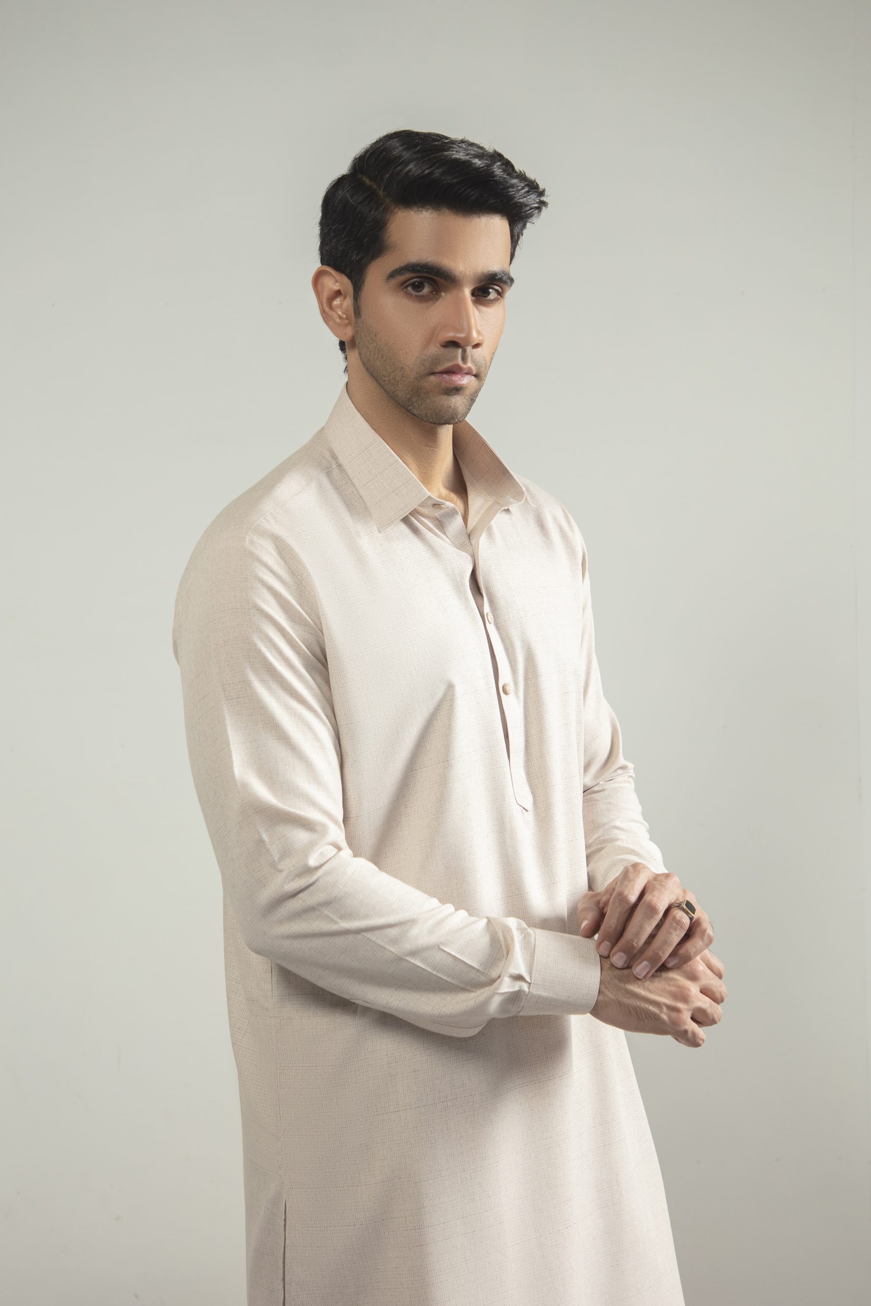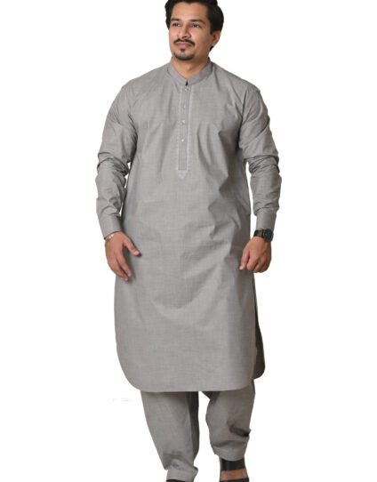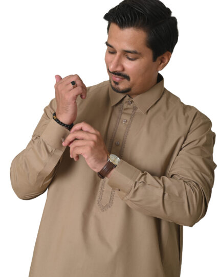 A perfect harmony of tradition and modern style, this Khakhi Pink embroidered shalwar kameez with a distinguished suit collar exudes cultural richness and refined elegance for every occasion.